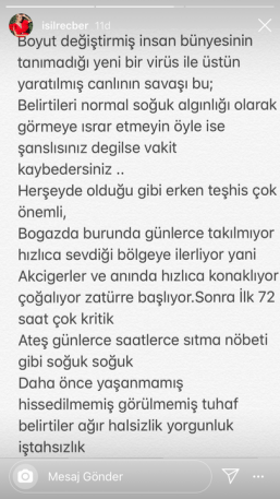 Medyatik olanlar göz önünde ama ne yazık ki hastaneler full herkesin ailesinden sevdiklerinden birileri var her şey insanlar için bugün bize yarın size Allah korusun. Sakin ve evde olmaya devam..." ifadelerini kullandı.