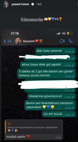 Yasemin Dursun, eşi Serdar Dursun ile Çaykur Rizespor karşılaşması öncesi yaptığı konuşmayı paylaştı.