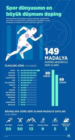 Olimpiyatlarda 149 madalya, doping nedeniyle sporculardan geri alındı, en fazla Rusların madalyalarına el konuldu, en çok madalyayı ise atletizm ve halter sporcuları iade etti