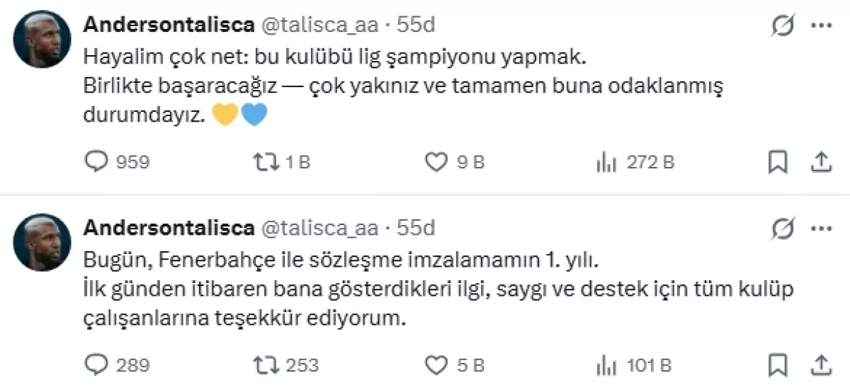 Trendyol Süper Lig ekiplerinden Fenerbahçe'nin yıldız futbolcusu Anderson Talisca, sosyal medya hesabı üzerinden bir paylaşım yaptı.