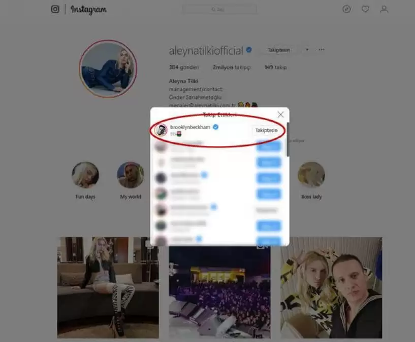 Dünya futbolunun önemli isimlerinden David Beckham’ın oğlu Brooklyn Beckham, Instagram hesabından Aleyna Tilki’yi takip etmeye başladı.