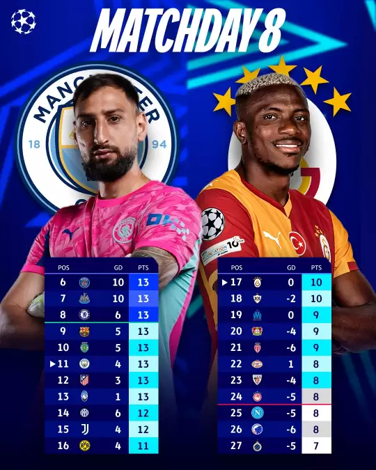 Büyük bir sürpriz olmaması durumunda UEFA Şampiyonlar Ligi'nde ilk 24 içinde yer alacak sarı-kırmızılı ekip, play-off'ta seri başı olmak için mücadele edecek. Galatasaray, müsabakası kazanması durumunda ilk 16'da yer alacak.
