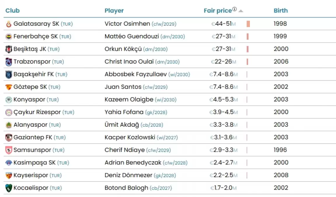 Öte yandan, CIES'in açıklanan tahmini transfer değerlerinde Süper Lig'de ilk sırada 44-51 milyon Euro ile Victor Osimhen yer aldı.
