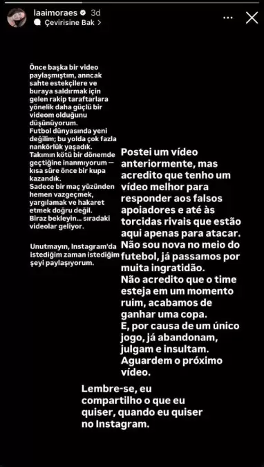 Futbol dünyasında yeni değilim. Bu yolda çok fazla nankörlük yaşadık. Takımın kötü bir dönemde geçtiğine inanmıyorum. Kısa süre önce bir kupa kazandık. Sadece bir maç yüzünden hemen vazgeçmek, yargılamak ve hakaret etmek doğru değil. Biraz bekleyin. Sıradaki videolar geliyor. Unutmayın, Instagram'da istediğim zaman istediğim şeyi paylaşıyorum."