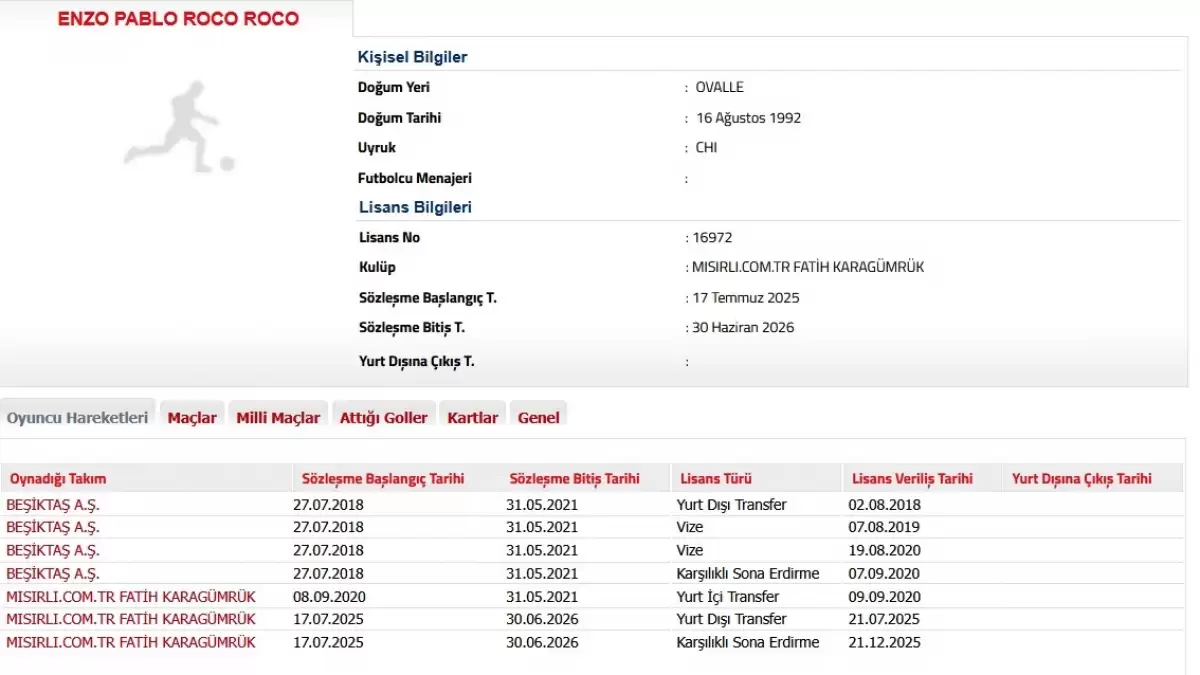 Daha önce Süper Lig'de Beşiktaş formasıyla mücadele eden Enzo Roco, Siyah-Beyazlılar'dan 2020 yılında ayrılarak Fatih Karagümrük'e imza atmıştı. Karagümrük'teki 1 yıllık sürecin ardından Elche formasıyla İspanya'ya giden Roco, Al-Tai ve Al-Riyadh takımlarıyla Suudi Arabistan macerası yaşadı. Fatih Karagümrük, Temmuz 2025'te tecrübeli oyuncuyu tekrar kadrosuna kattı.