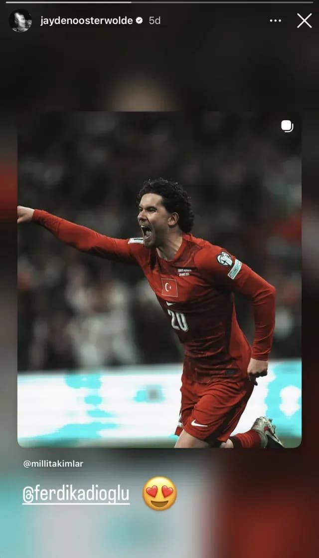 Maçın sona ermesiyle birlikte sosyal medya hesabından bir paylaşım yapan Oosterwolde, Ferdi Kadıoğlu'nun gol sevincindeki bir karesini takipçileriyle paylaştı. Hollandalı oyuncu, bu kareye "kalp gözlü gülümseme" emojisini ekleyerek eski yol arkadaşına olan desteğini ve hayranlığını dile getirdi.