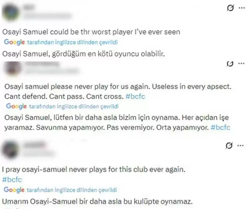 Maça ilk 11'de başlayan ve 72. dakikada teknik direktör Chris Davies tarafından kenara alınan Osayi-Samuel'in yenilen 2 golde doğrudan hatası olduğunu düşünen taraftarlar, Nijeryalı sağ bek ilgili çarpıcı paylaşımlarda bulundu.