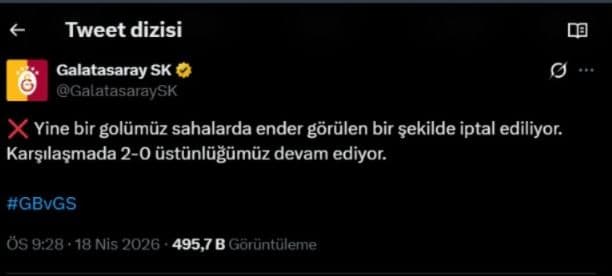 Galatasaray, Gençlerbirliği deplasmanında Leroy Sane ile 65. dakikada topu ağlara gönderdi ancak gol ofsayt gerekçesiyle geçerlilik kazanmadı. Sarı-kırmızılı ekipten karara maç içerisinde tepki geldi.