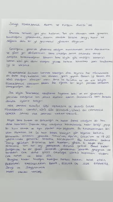 Futbolda bahis soruşturması kapsamında tutuklu olarak yargılanan futbolcu Mert Hakan Yandaş, cezaevinden yazdığı bir mektupla Fenerbahçe camiasına yeni yıl mesajı gönderdi.