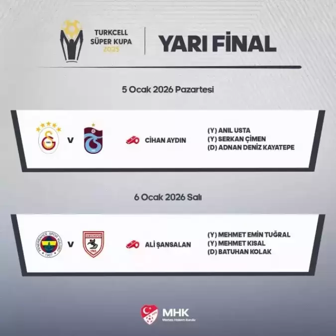 Türkiye Futbol Federasyonu, Turkcell Süper Kupa yarı finalindeki maçları yönetecek hakemleri açıkladı. Galatasaray-Trabzonspor maçını Cihan Aydın, Fenerbahçe-Samsunspor maçını Ali Şansalan yönetecek.