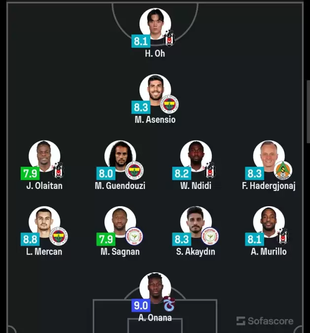 Süper Lig’de haftanın en iyi performans gösteren oyuncuları belli oldu. Trabzonspor’dan Onana 9.0 puanla zirvede yer alırken, Beşiktaş ve Fenerbahçe’den birçok isim listeye girdi.