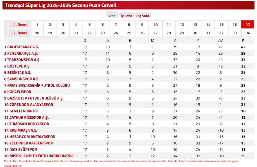 Trendyol Süper Lig'in 17. haftası bugün oynanan 2 maçla tamamlandı. Galatasaray ligin ilk yarısını lider bitirdi.