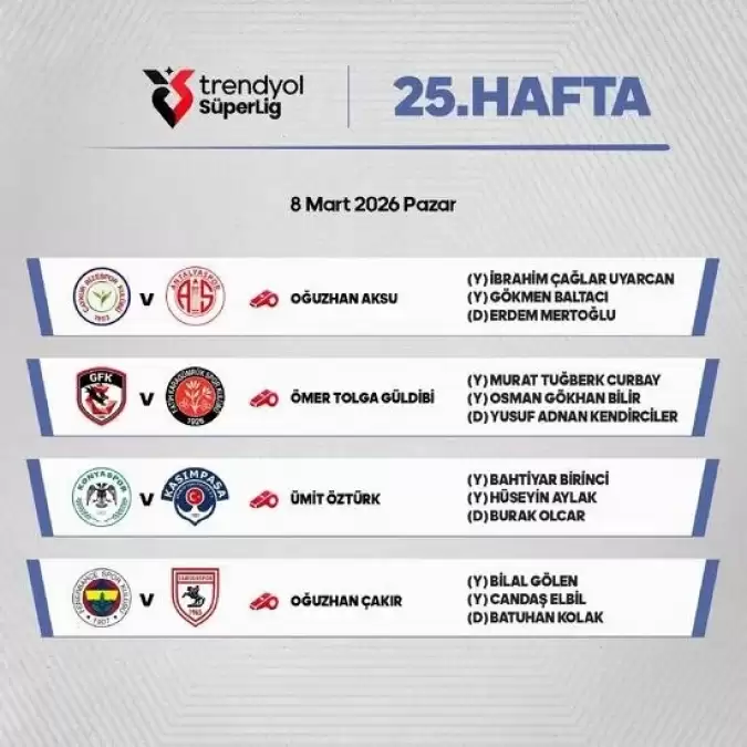 Ligde cumartesi günü oynanacak maçların hakemlerini daha önce açıklayan TFF, bu kez pazar ve pazartesi günü oynanacak maçların hakemlerini duyurdu.