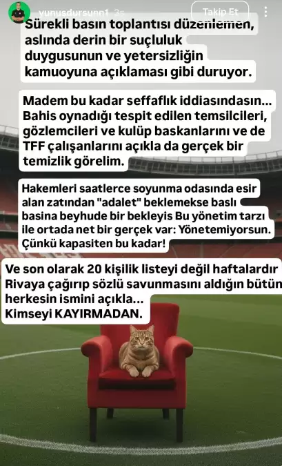 "Madem bu kadar şeffaflık iddiasındasın, bahis oynadığı tespit edilen temsilcileri, gözlemcileri, kulüp başkanlarını ve TFF çalışanlarını açıkla da gerçek bir temizlik görelim. Kimseyi kayırmadan!