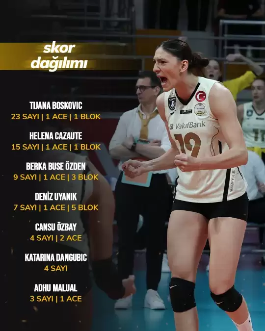 VAKIFBANK: Cansu Özbay 4, Helena Cazaute 15, Berka Buse Özden 9, Tijana Boskovic 23, Katarina Dangubic 4, Deniz Uyanık 7, Aylin Sarıoğlu Acar (L), Adhu Malual 4