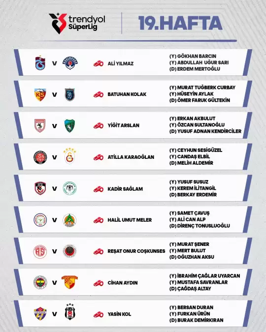 Türkiye Futbol Federasyonu Merkez Hakem Kurulu, Trendyol Süper Lig'in 19. haftasında görev yapacak hakemleri açıkladı. İşte maçlarda düdük çalacak hakemler...