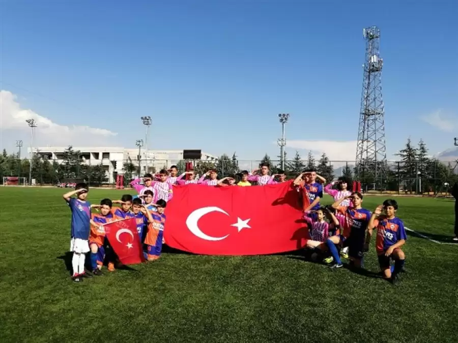 Yeşil sahada, miniklerden Türk Bayraklı asker selamı